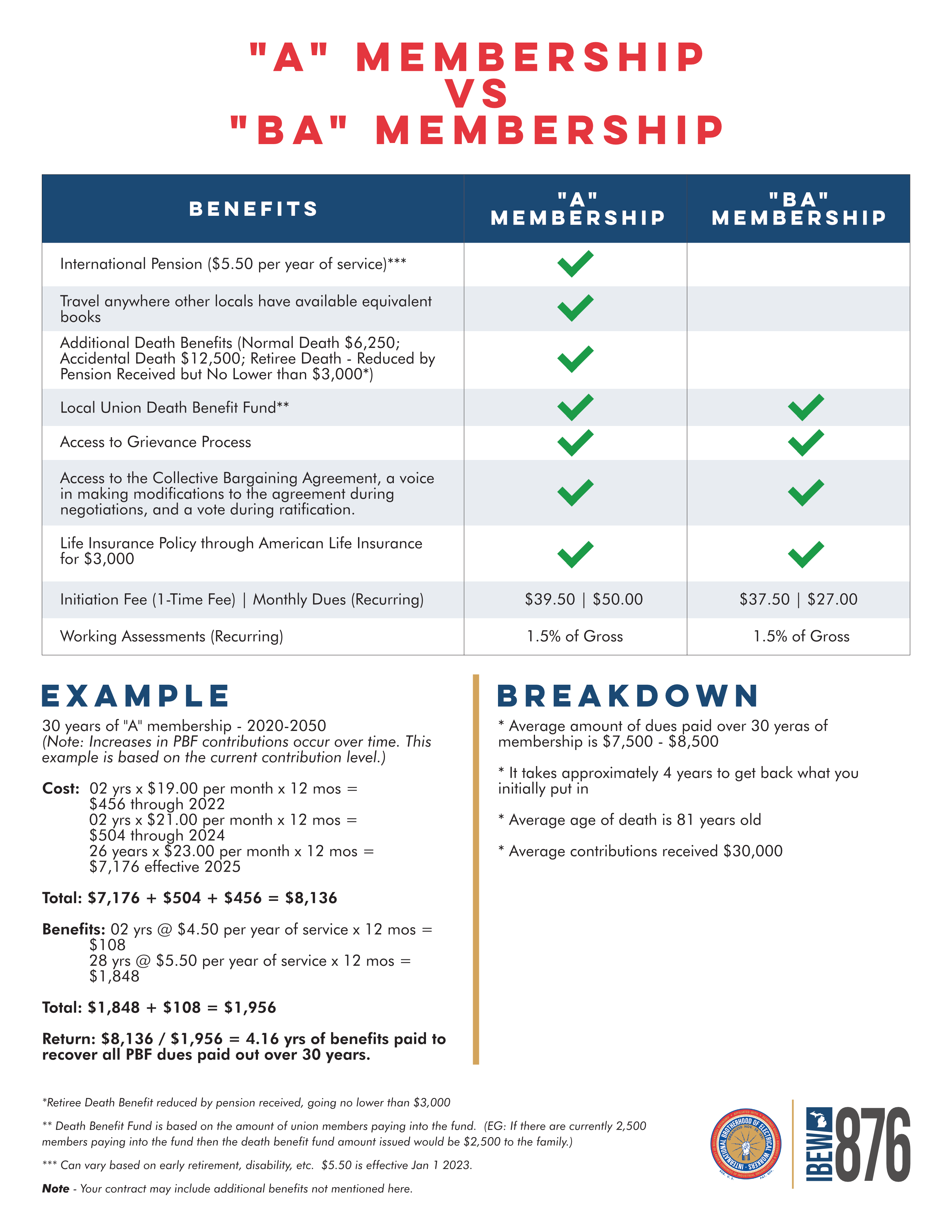 The IBEW offers 2 membership types, A and BA. Please use the chart below to compare the two options. Please note that the type you choose impacts the amount of your Monthly Union Dues, so please choose carefully. Union Dues are not deducted from your paycheck.